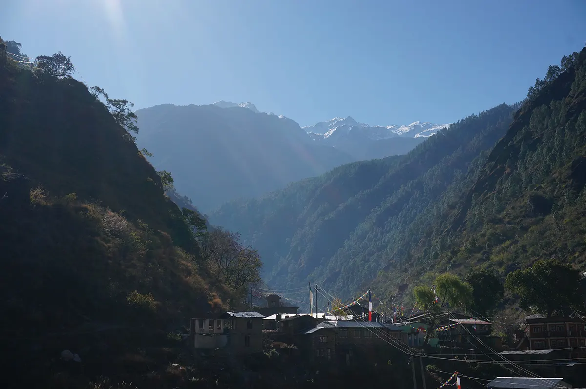The National Park army checkpoint will ask for our permits, then our road will take us down to New Syabru Besi above the Bhote Koshi River. Next, an expansive bridge will guide us to the Old Syabru Besi, squeezed on three sides by the mountains of Ganesh, Manaslu, and Annapurna.