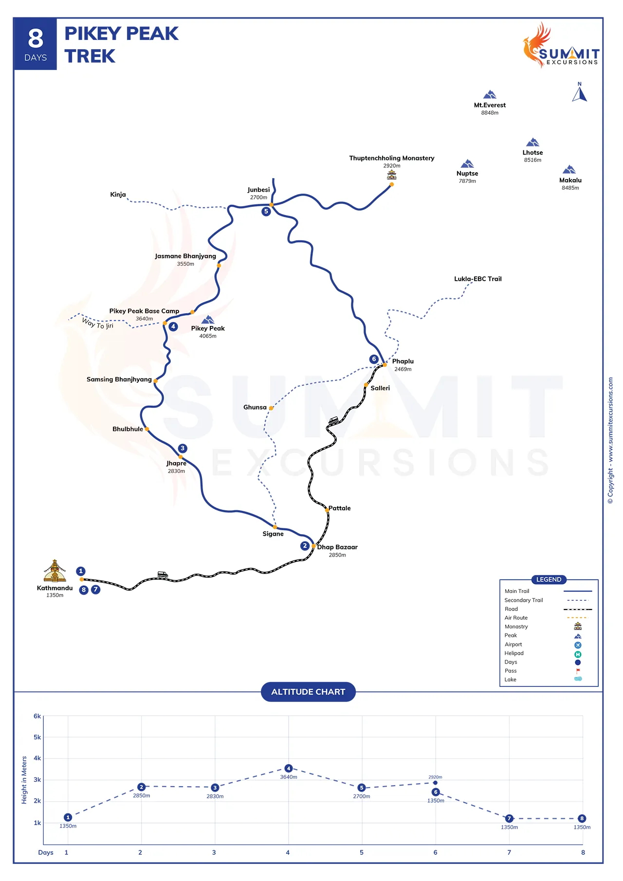In our 8 days Pikey Peak trek, you can expect days to be medium difficult while the Pikey Peak itself standing below 4100 m is considered the most achievable peak in Nepal, making it accessible even for those new to trekking.